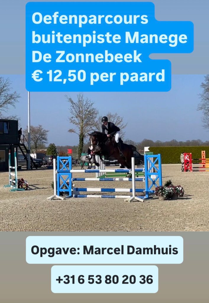 Ook dit buitenseizoen is het weer mogelijk om oefenparcoursen te rijden in onze outdoor zandpiste waar een volledig parcours met 10 hindernissen en 13 sprongen staat. Kosten € 12,50 per paard. Neem hiervoor contact op met Marcel Damhuis 06-53802036